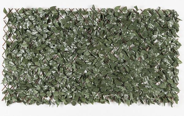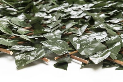 Συνθετική φυλλωσιά που μοιάζει πολύ με φυσική, πλεγμένη πάνω σε ξύλινο πτυσσόμενο καφασωτό.
