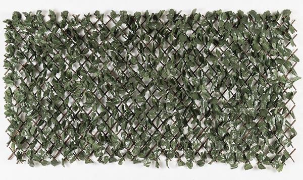 Συνθετική φυλλωσιά που μοιάζει πολύ με φυσική, πλεγμένη πάνω σε ξύλινο πτυσσόμενο καφασωτό.
