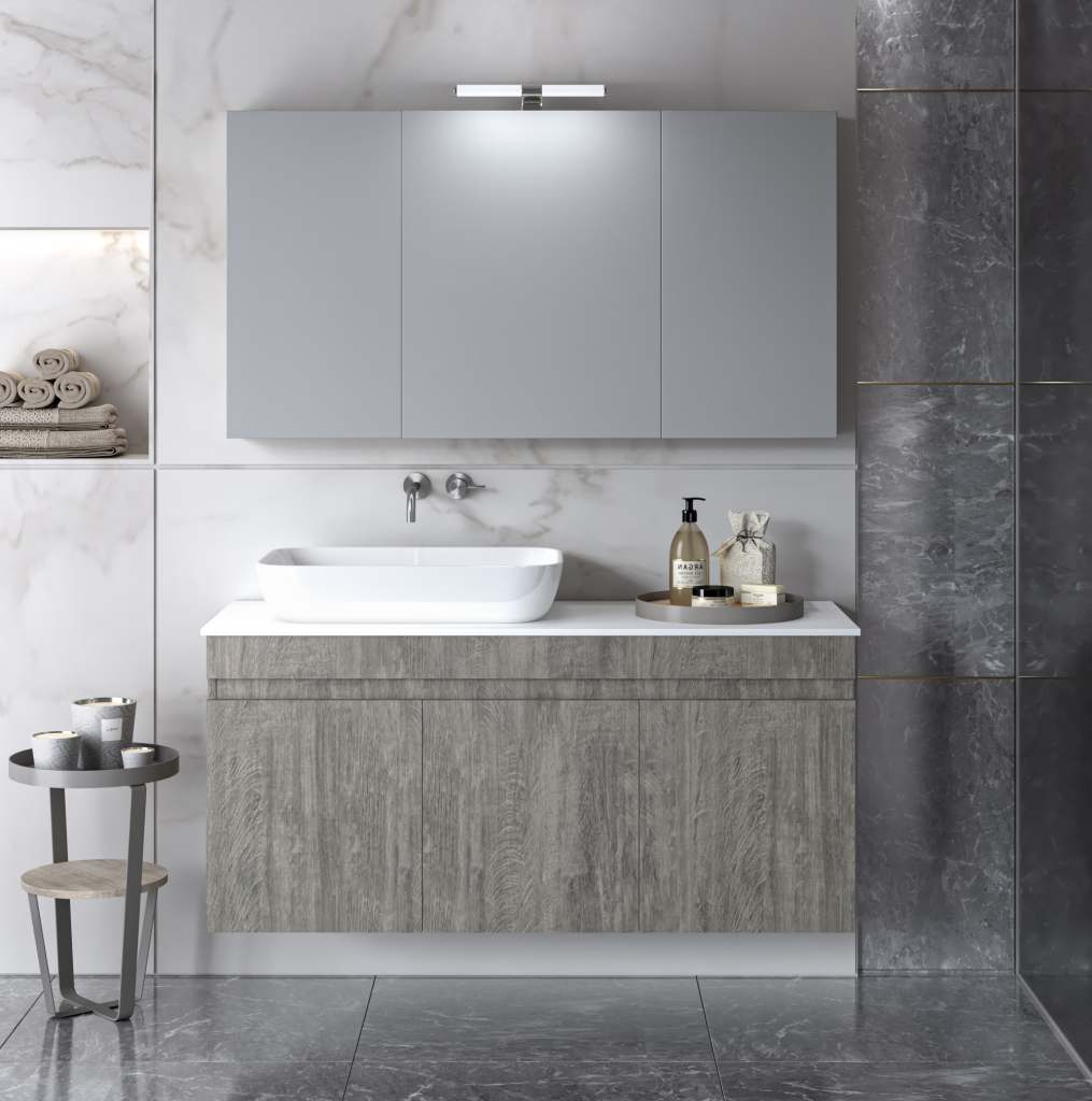 Πάγκος κρεμαστός OMEGA Σταχτί 120 με τέλεια εφαρμογή σε όλες τις επιφάνειες με ή χωρίς πλακίδια. Περιλαμβάνει μεγάλο ερμάριο για την εξοικονόμηση επιπλέον αποθηκευτικού χώρου στο μπάνιο.